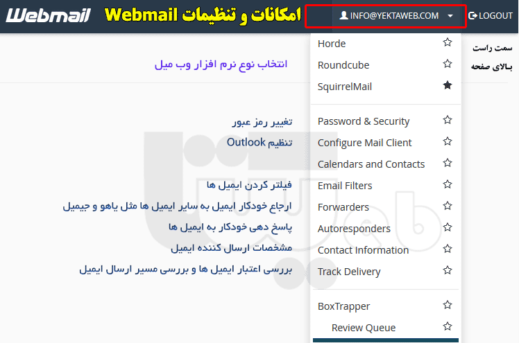 راهنمای سرویس Webmail برای استفاده از سرویس ایمیل از نشانی سایت خود به همراه webmail (پورت 2096) استفاده کنید. برای مثال: https://yektaweb.net/cpanel گاهی در شبکه دسترسی به این پورت وجود ندارد. در این حالت نشانی زیر را امتحان کنید: https://yektaweb.net:2082 گاهی در شبکه دسترسی به این پورت نیز وجود ندارد. در این حالت موضوع را با مسوول شبکه خود طرح نمایید.